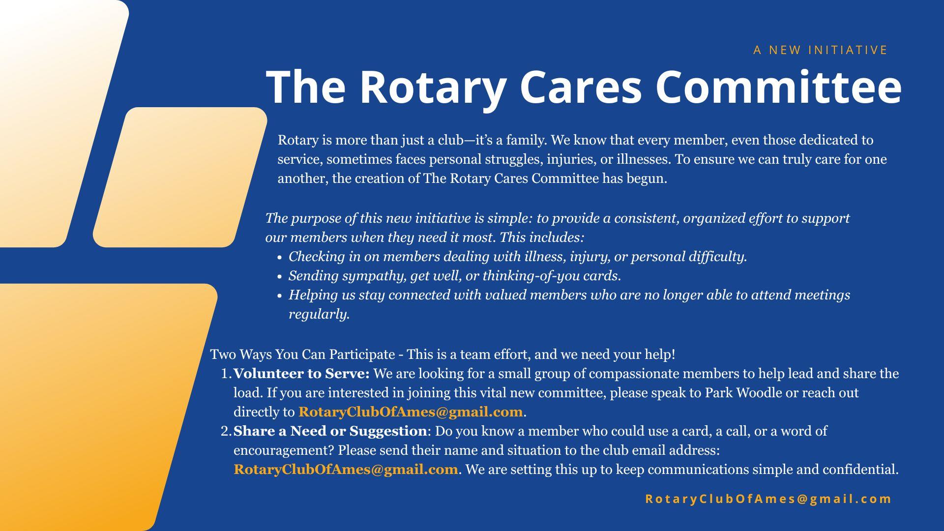 Rotary is more than just a club—it’s a family. We know that every member, even those dedicated to service, sometimes faces personal struggles, injuries, or illnesses. To ensure we can genuinely care for one another, the Board of Directors has enthusiastically approved the creation of The Rotary Cares Committee.